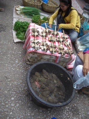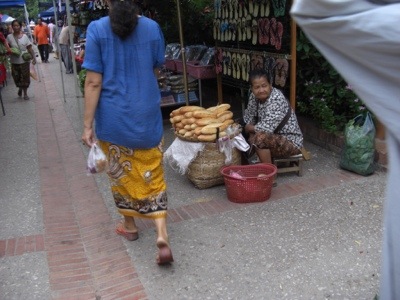 There were vendors who were getting their first sale at 9pm at night! You can tell bcz they take the money and slap all their goods and their money pouch for good luck. If they like their neighbor and they have not made a sale, they will take the money and slap it on their stuff too. Supposedly they give a good discount to first customer….no idea if this is true or not…but it is fun to think you might be first customer and getting a super good deal. I bought some stuff last night that opening price was 420,000 kip and I got it for 240,000. So felt good about that, but you always ponder if you could have gotten it for less. Probably…but then I always look at these things like this….what would I pay at home (if I could even get it)? What is it worth to me? And….do I need the $1 USD more or less than them? So you can see this is not easy for me…especially when they put their CUTE little babies out.
