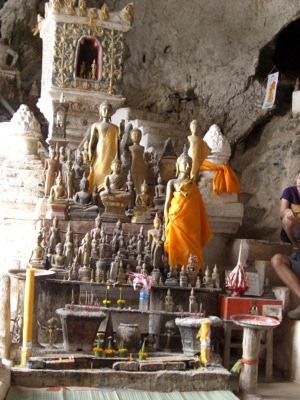 After eating I dragged (yes dragged) Troy to the night market. It is similar concept to other big markets we have been to…local folks drag their wares down to main street and hope that some tourist will come by and buy something. Major differences to note. There were no tables….everyone sets their stuff out on mats on the ground, 95% of the vendors had matching pop up tents, (mostly red, but there we a few white ones), it was 100% tourists that were shopping, and it was not nearly as busy! The other markets we have been to seem to cater to locals and tourists. There was also much less variety in the goods. There were a handful of t shirt guys and they literally had exactly the same t shirts. Same with the dozen or so scarf ladies…literally identical. So not sure how a vendor distinguishes themselves? Maybe price? Not sure if they have agreements amongst themselves about how low they will go? There was jewelry, wallets and pouches, dresses, blankets, silver, keychains and artwork among other things. I got a couple things, but will go back myself tonight probably to get a few other things that caught my eye. I am unsure how much shopping there will be in Vang Viene….as I think it mostly a drunken tubing party town for young Europeans….so don’t want to be left hanging….we packed tight on this trip with only 2 small backpacks….so will be going to town to get another bag today I think ; ) not buying as much as in past years, mostly because we already have a lot of the trinkets they are selling (in Thailand particularly), although I can see the stuff here in Laos is slightly different flavour….so that may bump up my shopping here : )