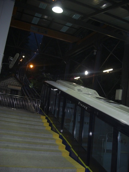 So we got to Penang Hill at 7:45 pm and we are able to catch the 8pm funicular train to the top 800m up! The whole thing took I much longer, so we are going to miss the sunset, but are led to believe the nighttime view is very good also. So 60 ringgits round trip to ride the train. Believe it or not there is a set of stairs to the top also, but we just don’t have this kind of time….so we take the train. It is very cool actually, if only a little scary!
