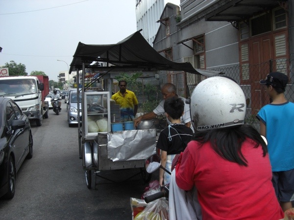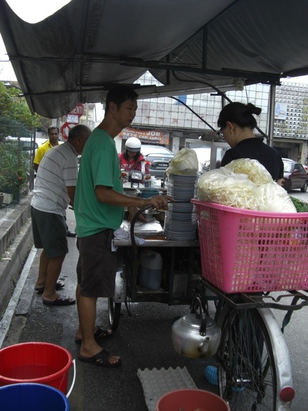 So the desk guy here at the SO Hotel asked me this morning if I am enjoying the food. I had to be honest and say…not really, we haven’t found much with wow factor! So he apologized a tonne that his staff hasn’t given me better information about great local food. He told me about an old man that sells a fried noodle dish right outside the hotel from 3-8 every day for 4.20 ringgit! (That is $1.21 USD). He said the line up can be very long as he sells about 500 plates every day there. So I made sure I was back right at 3 pm to be in line! It took about 30 minutes to get my 2 orders…it was pretty good I must say. The guy looked ancient, and he cooked over charcoal in a big wok. He cooked with one hand and fanned the charcoal constantly with the other. This is unusual….normally these bicycle cart guys use propane. And his cart was attached to a real pedal bicycle….not a motorbike like a lot of other ones we see. It was very interesting to watch! He could crank out the meals so fast he had a full time guy just wrapping and taking the money!