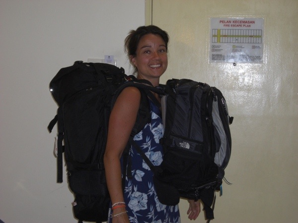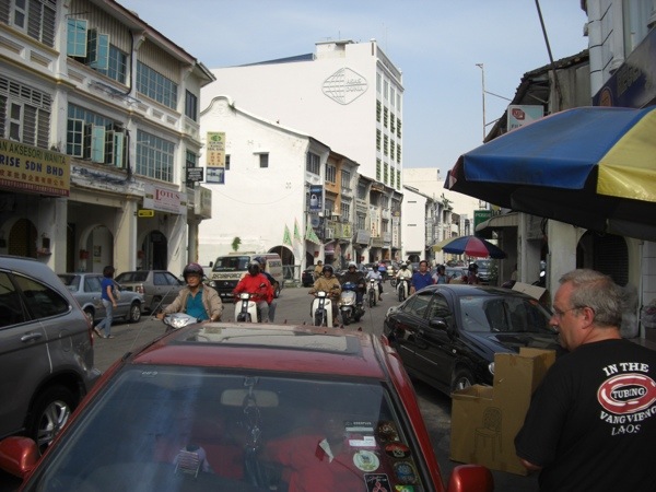 Uneventful flight to Kuala Lumpur, then connected to Penang. Now here is my tale of the bags. They weighed more than the stupid allowance….but those sweet check In Gals at Chiang Mai let it slide. They were 16.2 and 16.4 kilos and I had registered for 15 kilo bags…so I thought that it would get through all the way….but NO! The much more stickler check in gal in KL said I could take 1kilo out of each bag, or pay 30 ringgit for each kilo over (that would be $20 USD!) for 2 kilos!!! So there I was….one of those people opening their bags pulling out their nightie and dirty clothes etc to get the bag under the weight limit. But then my problem is that I have to put it in my carry on….which I am already worried about being over size and I know it is over weight (only 7 kilo for carry on). But I must have looked sufficiently annoyed that she gave us the tags for our carry on so that when we got to the screening point for carryon and I am watching them turn away half of the people with backpacks, I say “we have already got out tags” and she say “oh really, ok…..” And off we go!!