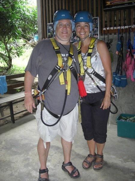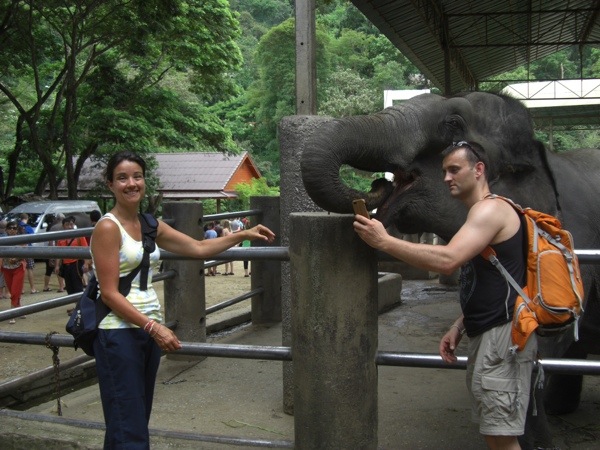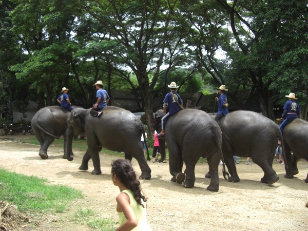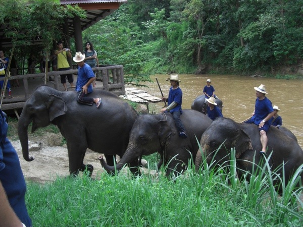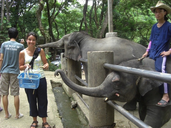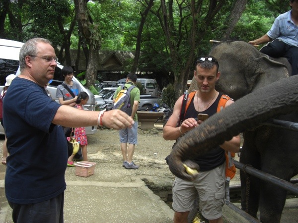 Then our arrival at the elephant park! This is always so well done in our opinion. We have been to this elephant camp twice before and feel that the elephants are happy, and well cared for in this environment. (Compared to the elephants we have seen walking the streets on Bangkok begging for food and money) Asian elephants eat 250 kilo (550 lb) of food every day and 150 litres (40 gallons) of water. That is a lot, and there is no way that can be done by begging for bananas in the concrete jungle that is Bangkok. Anyway, for 100 baht, you can buy a big basket of bananas and sugar cane and feed it to the elephants and all the little babies (SO cute!!). Not sure how much of the 150 kilos they need comes from us….but they can easily make up the rest with the ample jungle environment they live in! It’s really great up there! We had a lot of fun!