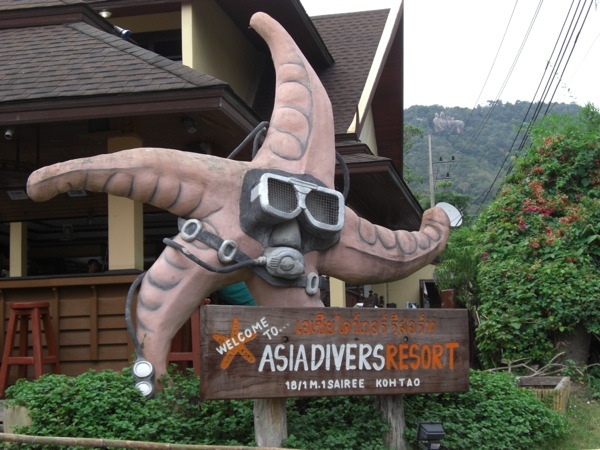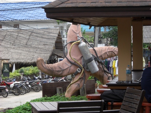 Our hotel is called the Asia Resort. But the 100% compete focus of everything on this island here is diving, diving, diving. So the starfish (Patrick?) that sits out front is all dressed up in dive gear…kind of cute that Patrick is here diving in KohTao!
