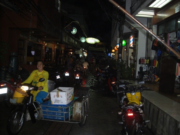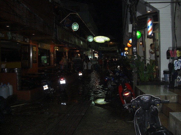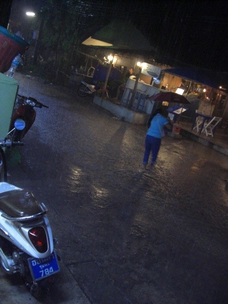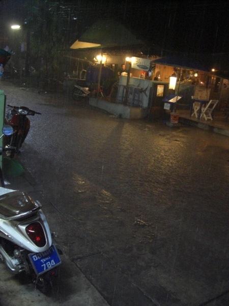 After we went for massage and supper, we were planning on walking to the beach to see what goes on there at night. We got about halfway down our street and felt a couple raindrops, then a couple more….we looked at each other and said…feels like rain…hmmmmmmm….in that nanosecond of time, the skies opened up into a monsoon that can’t really be described….we jumped to the side and ducked under a shop’s awning along with a handful of locals who were trying to close up said shop. The street became a river in less than 2 minutes…..