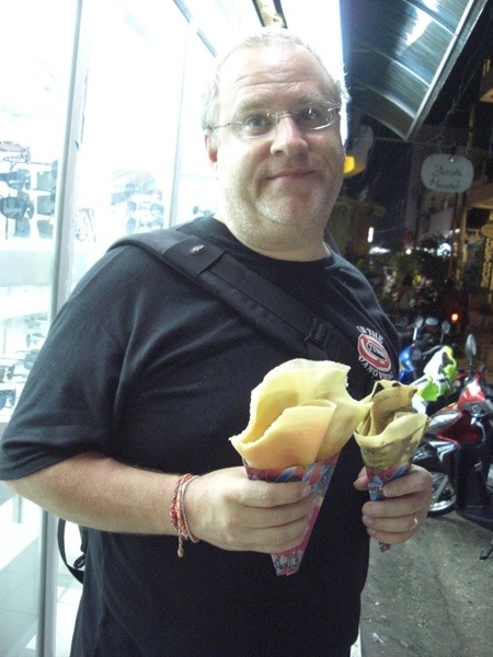 Trying not to talk about food too much….but these crepes were something we had seen around a few times in Chiangmai mostly….so I was anxious to try. They are very good…not better than the banana pancake or the donuts with pandanus custard, but still quite tasty : ) I can see myself having another!!