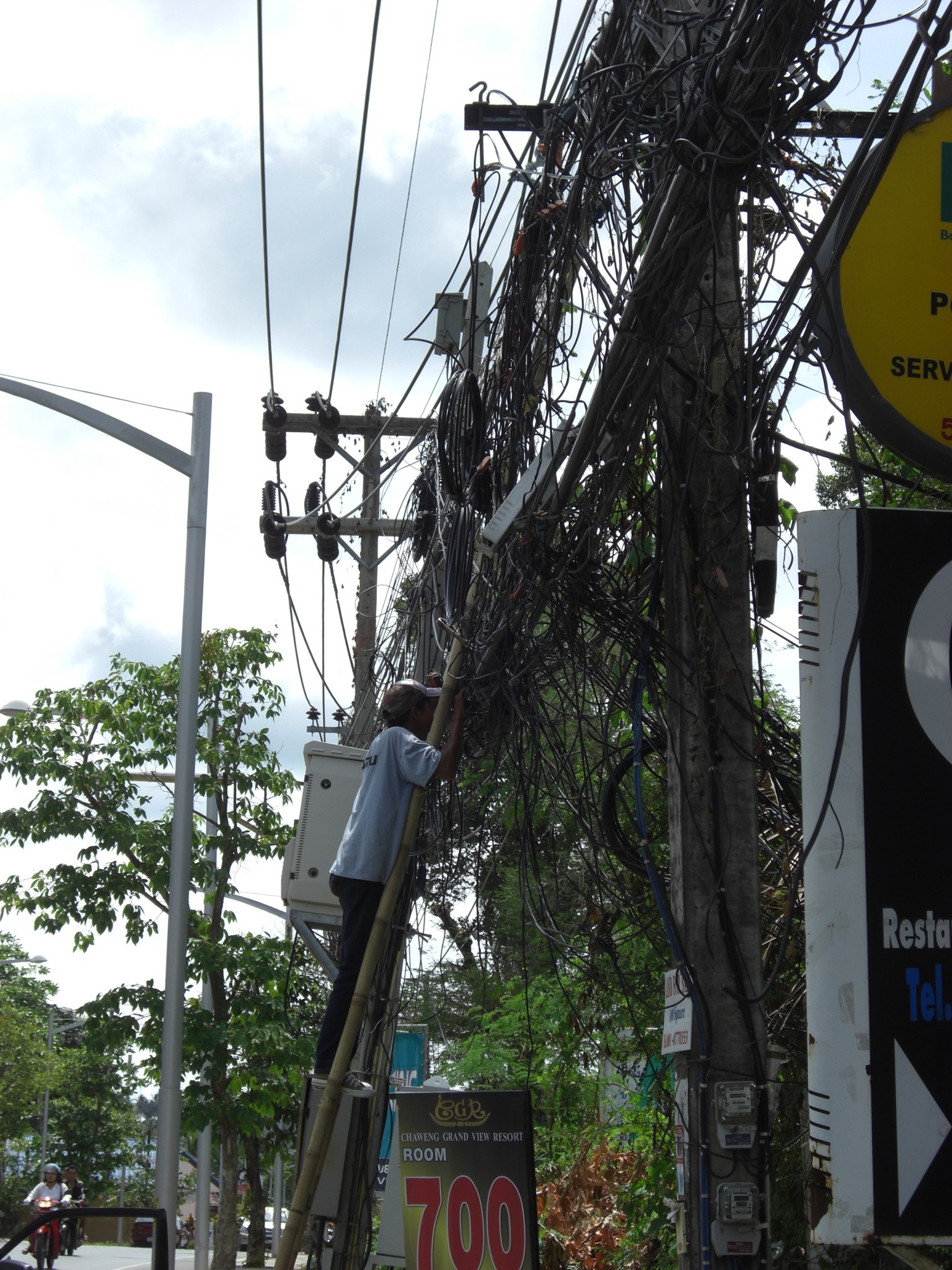 Saw the electric company put doing some work on the power lines along the way too. Not sure that anything about this would pas OCEA criteria in North America, but what do I know…bamboo ladders have been working around here for a long time….no comment on the actual power lines…those are a constant source of absolute amazement for us here!