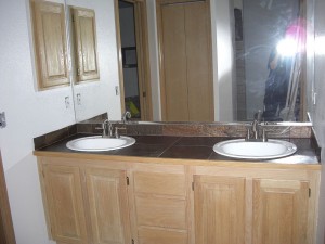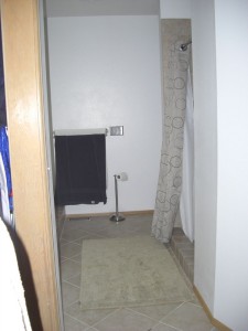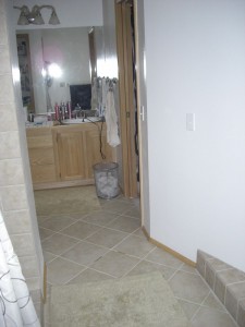 Oops–forgot to put up some pictures of the finished BR! Just a couple odds and sodds to finish up (putting thresholds on the 2 doors, putting the closet door back on, touch up ceiling paint where I nicked it with the wall paint, paint corners in skylight, tiny bit of caulking around tub TBD) You know I can never be totally done anything. There is still one cover plate to get out on the kitchen too ; )