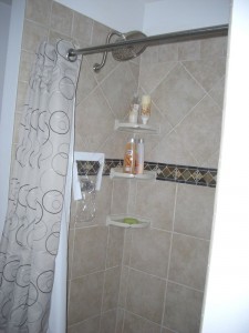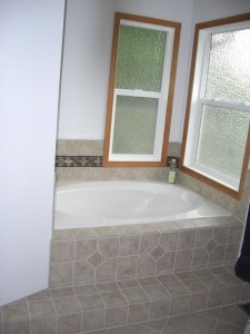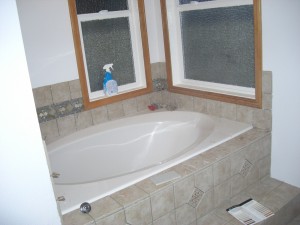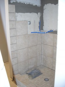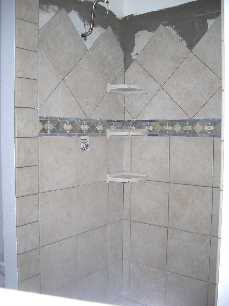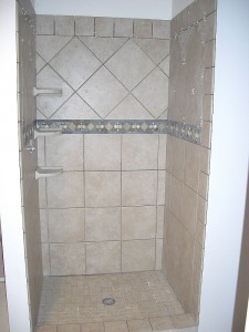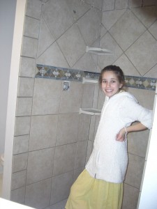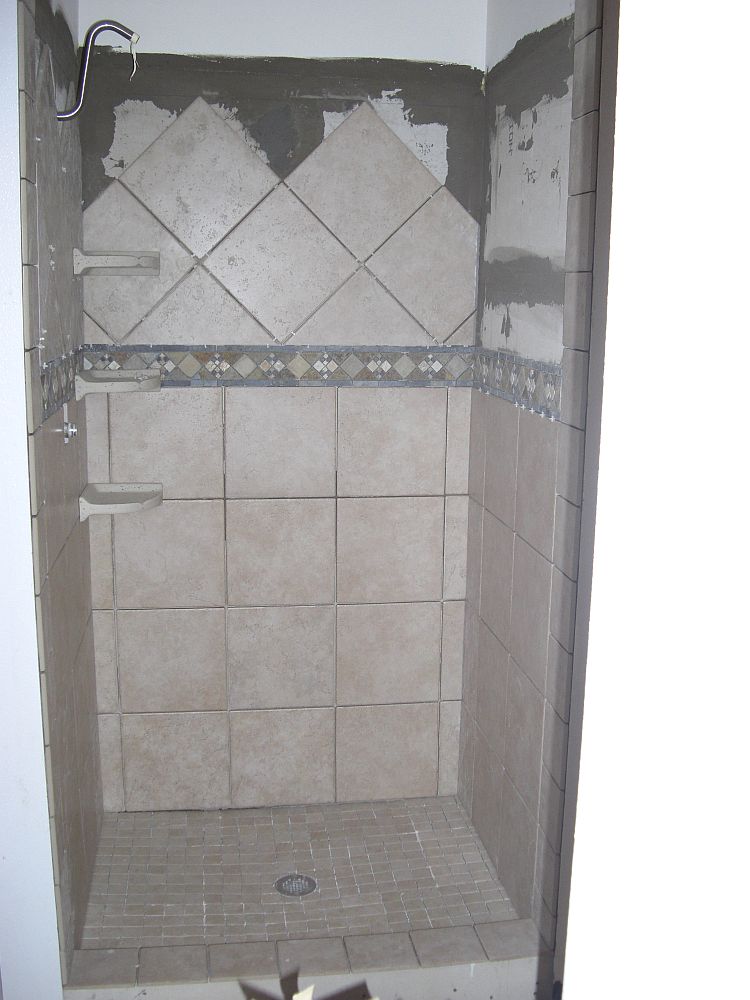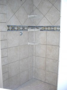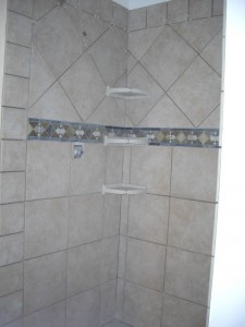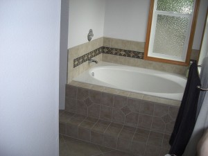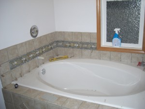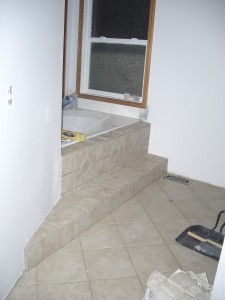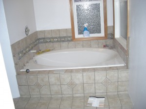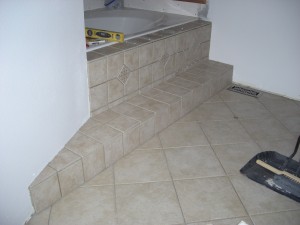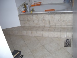 So tomorrow I put the wall tiles up around the tub and then I am done!! Except for the grouting as Jackie just reminded me. I am planning on using the 6x6s on the walls, just like the steps, with the decorative 4×4 inlays…Yeah–those were fun too!!!