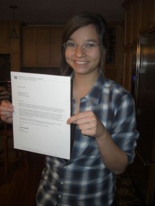 That would be the University of Washington Bothell campus–wahoo!! She will be able to stay home as this campus is 20 minutes away. Small campus (less than 4,000 students). We are very proud of her and excited…Here she is with her letter…