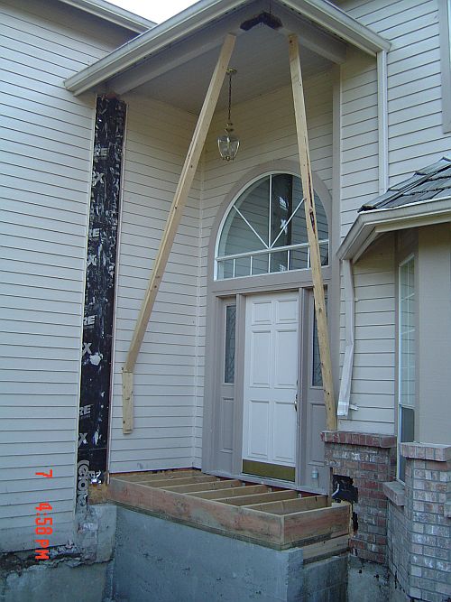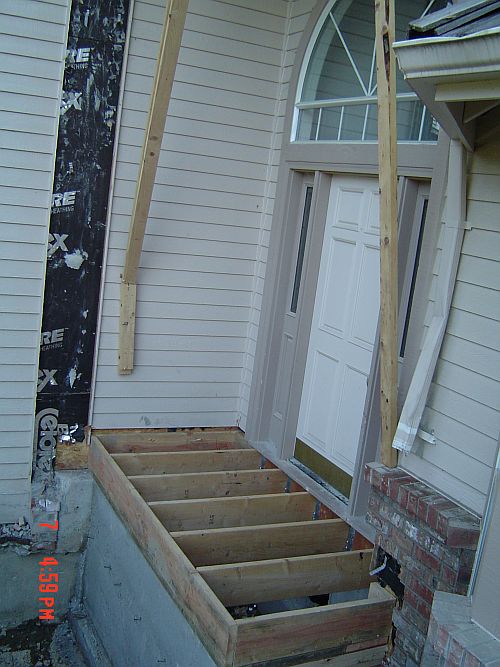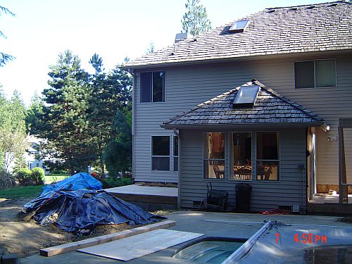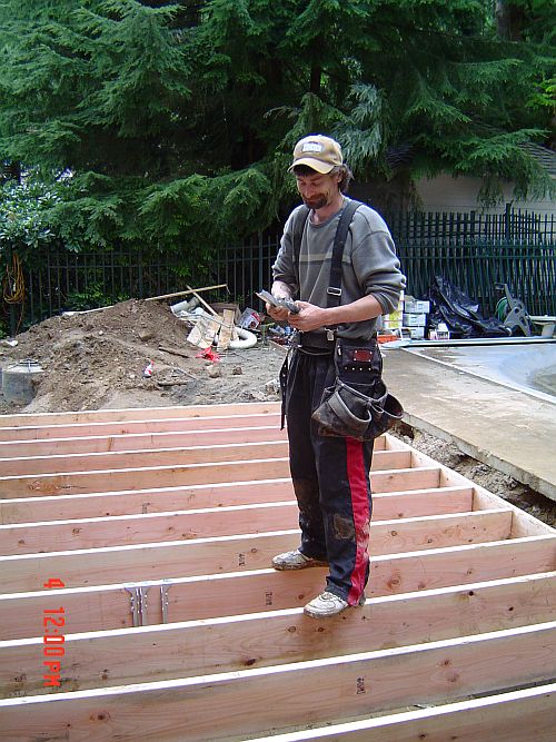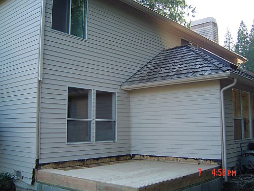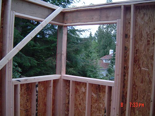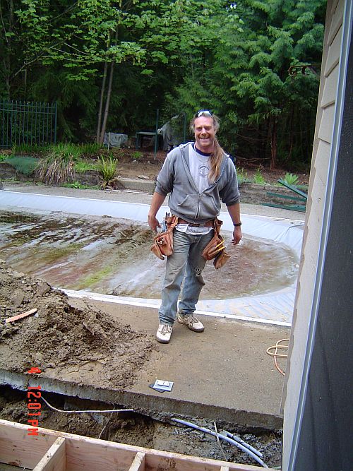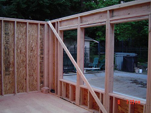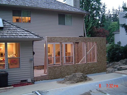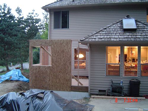 OK–so yesterday i said something about having real walls…now I want to take that back–TODAY we have REAL walls! Doug and Dion were here from 7:30 to 3 today and they got a lot done. They got the sheeting on the floor of the entrance area, framing and sheeting for the kitchen area as well as the sheeting on the walls in the sunroom. They also waterproofed the foundation. (You can see it is painted white in the pictures) That was actually interesting…it was this super thick goopy white stuff they painted the outside of the foundation walls with. All the better to keep the moisture out with I say—WaHahaha—that would be my big bad wolf imitation