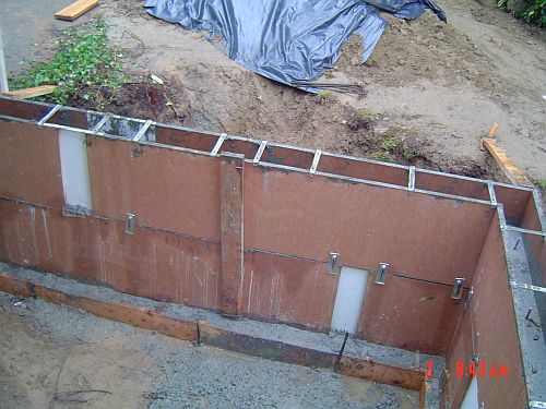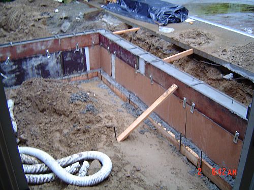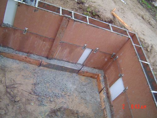 Now I have said this before, but today really was a kinda quiet day. They stripped the forms off the cement foundation walls–they really are little walls about three feet high. There is a place where the wet cement bulged out the form and so the wall looks like it is pregnant. This is at the front door. You can see it in the second picture down in the post from this morning where the white section is bulging out. Kinda cool…makes me realize how heavy that cement was and the forms were at least an inch thick. The cement has to cure another day or so…but the lumber is getting delivered tomorrow for the framing–SO that is great! Andrew thinks we are going to have our under floor inspection on Monday, walls up by Wednesday and MAYBE tearing off the roof and bringing the steel beam in by early the following week. Maybe he is going so quickly bcz he is not happy here…hmmm…can’t imagine that