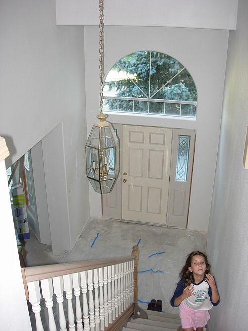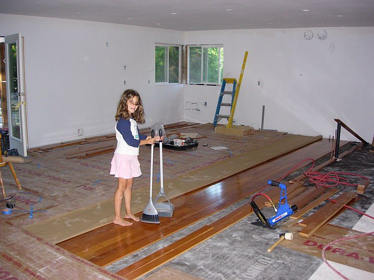 There is so much to do…I have to finish the hardwood up the hall to the front door, do the tile inlays at both doors, remove the old oak floor in the mudroom and do the tiling there, refinish the cabinets and install the new faucets in the powder room, power wash and seal all the concrete, mark and get John to fix all the places where the drywall is not right, paint, paint, paint, get the carpets installed, order and have Leroy install all the window wraps and trim for the main floor, install the hardwood in the girl’s dormers, paint them and get Leroy to do the window wraps and trim in the girl’s rooms, put the girl’s rooms back together, paint the inside of the front door, get the trimout done on the four colums, have Mario come back and paint the outside of the french doors and the front door and the four colums, have Dave come back and patch the concrete where it needs it, fix the house where he made holes from the forms and splattered concrete on the new paint, get the gutters on (this should be done on Sept 6th by Big John)…and this is just what comes to the top of my head…so do y’all see why i am in my PJs in the fetal position