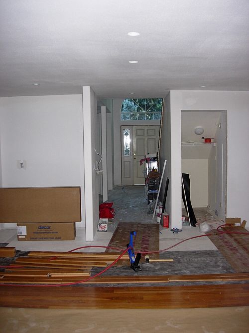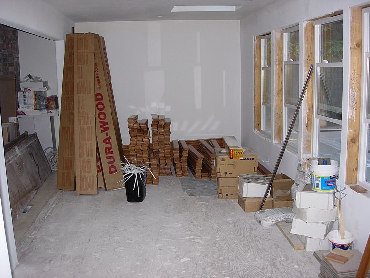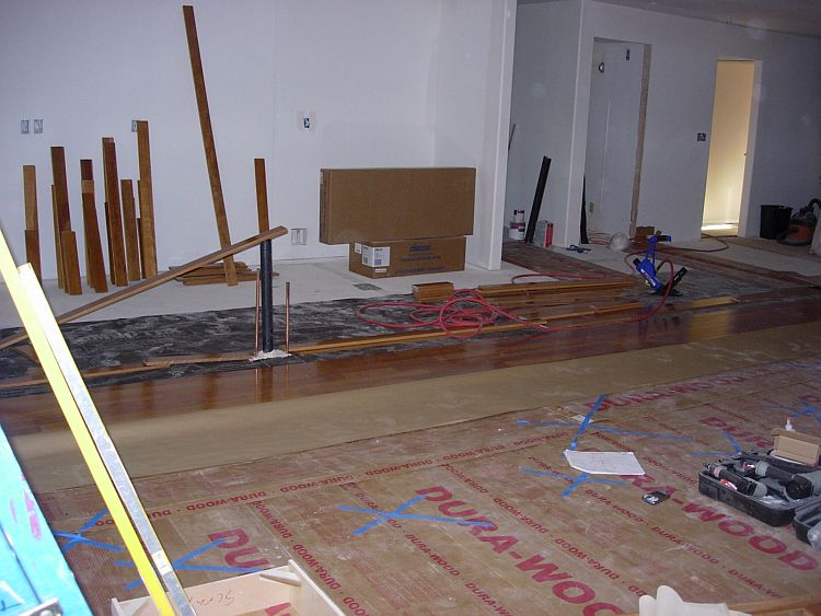 See that is really our news of the day, “we” are ready to start the cabinets. NOW we have some progress!! We started laying the hardwood last Sat (with the help of Doug). It is very tricky to get started. Especially when someone (that would be me) wants to do a framed tiled inlay and has a flushmount register 2 inches away from that. But none the less, we made great progress and I have been chipping away (not literally) at it Mon and Tuesday while Troy was at work.