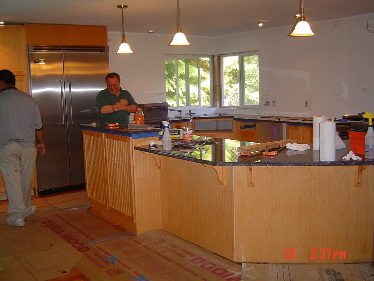 Here are the guys working on it…They got here about 10:45 this morning and were still here at 6:45 when I left to go pick up Jackie from her friend’s house…this installation thing is much more of a process than I ever imagined! The work to make the seams as invisible as possible…as well as installing the sinks–WOW! Oh yeah…and smelly too…the epoxy is nasty stuff…like brain damage nasty stuff. SO between my painting (I have to do something to keep me busy) and the epoxy…it was a no kid zone in our house today!!