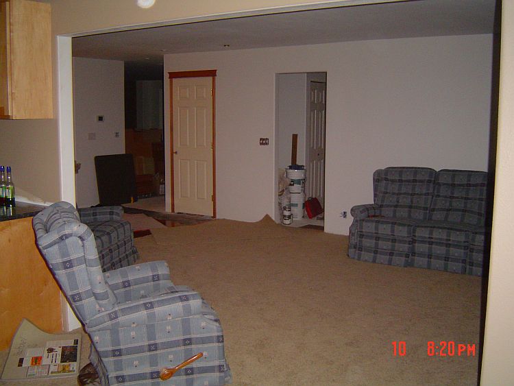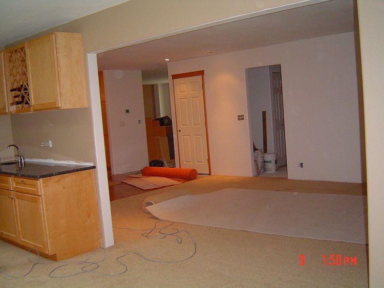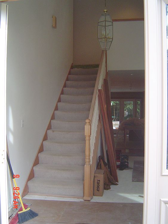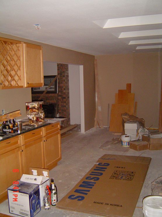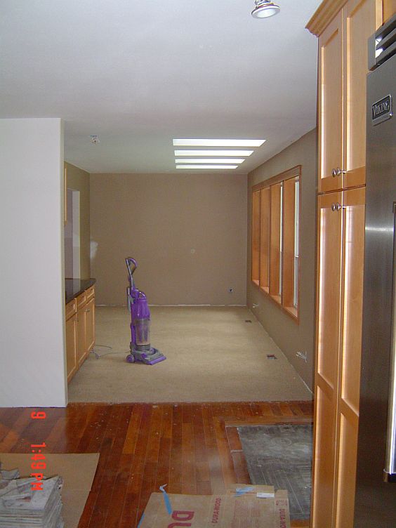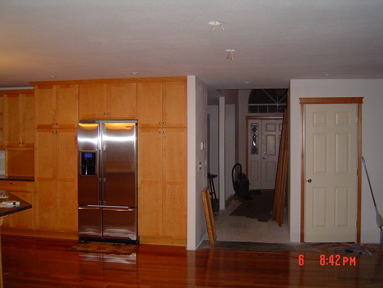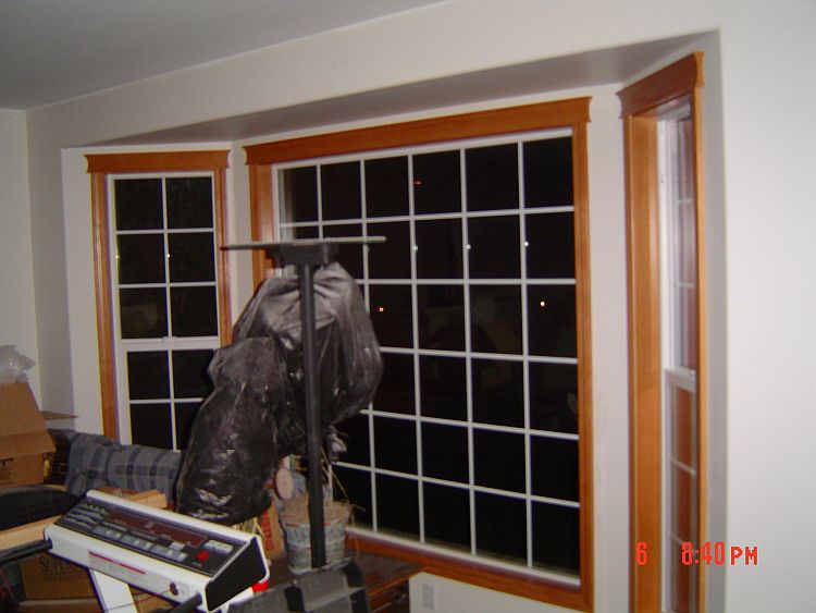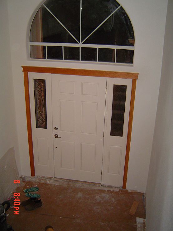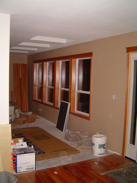 We are close to the end now…YEAH! Leroy was here on Friday (and will be back tomorrow) to get the rest of the trim done. You will see in some of the pictures below that he got the door and baseboard trim done in the mudroom and the baseboards in the family and the sun room. Still to go is the foyer and the living room, Jackie’s window and one piece of floor trim in Rachael and Jackie’s room. He has a bunch of puttying to do as well as a few things on a pick up list for the kitchen.