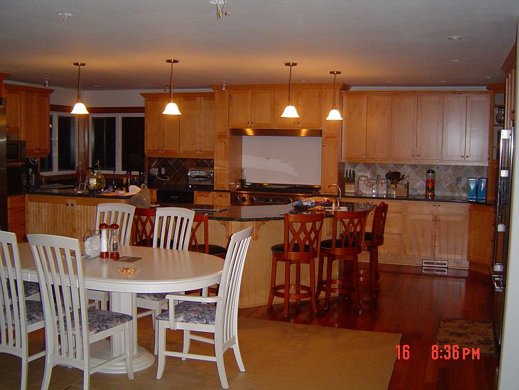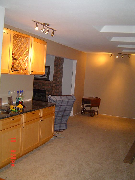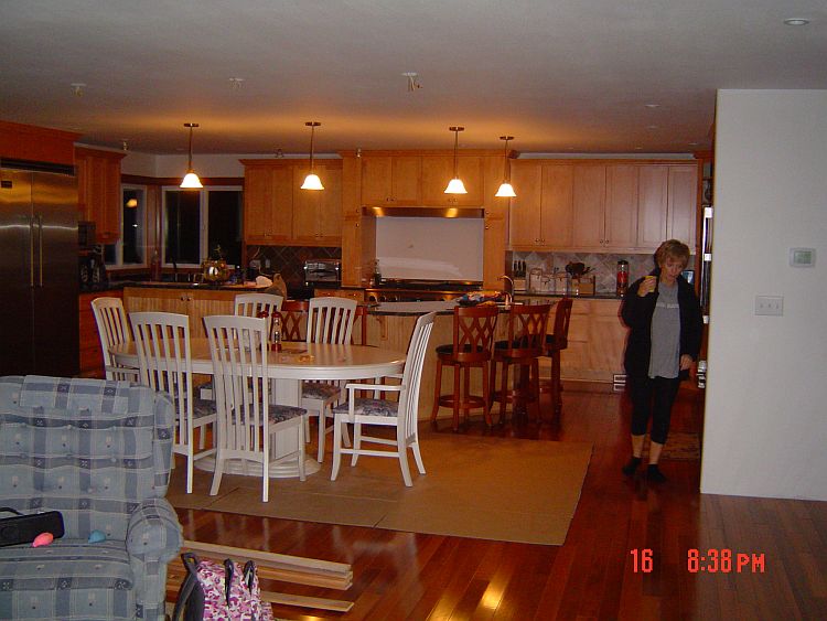 Since we have the white table in the eating area now (until we get the proper one that will fit), Troy just put in one of the three chandeliers that will hang over the table.