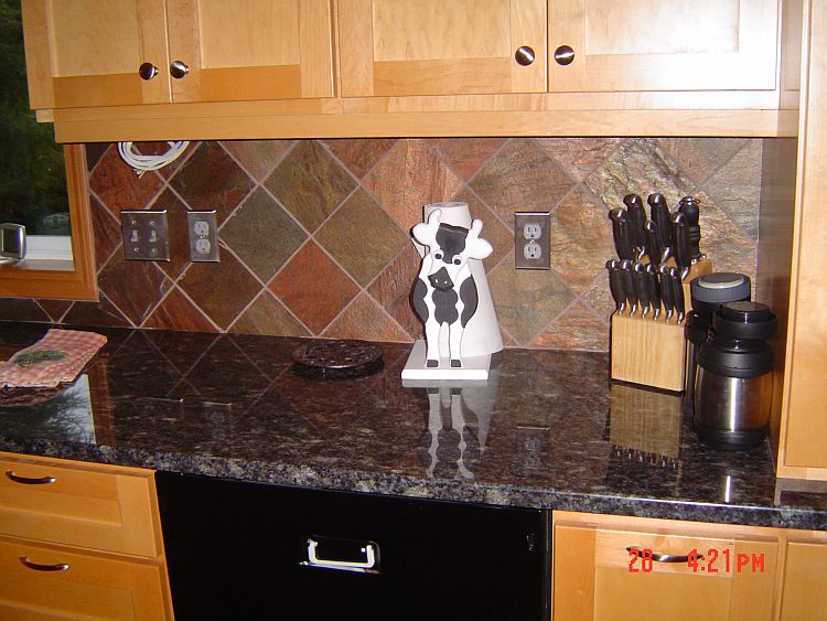 We chose to use satin nickel plates on the outelets and switches in the kitchen. It looks really good and blends more with the slate that a white plate would…