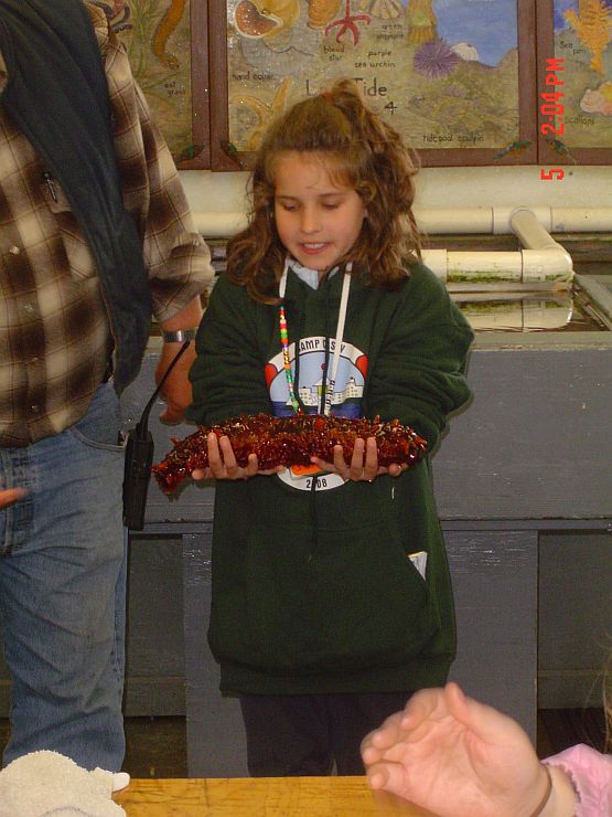 Jackie holding a sea cucumber as part of the marine biology lesson