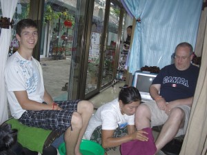 So Troy has decided there is an advantage to being big big (what they call us farang here in Thailand)…it means he always gets the front seat and The rest of us pile in the back, whenever we go somewhere. So while his ride was not exactly comfortable–it HAD to better than Russ, BK and I being jammed in the back of the jeep with a seat that was about 3-4 inches higher on the sides than in the middle–so we constantly were sliding down and crushing whatever poor soul was in the middle–we took turns…now no picnic to be on either outside either. As there was nothing to hang onto but the headrests of the seats in front of us to keep us from bouncing right out. Russ took a bullet for the team for a while and sat inthe trunk…I have a picture of that and will post when I get my pictures ready…We got such serious air a couple times, we bounced right up and bonked our heads on the ceiling of the truck. Anyways–it was super fun and the kids were PUMPED! Amazing way to end our special time in Chaing Mai.