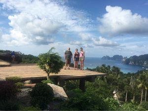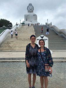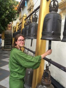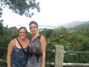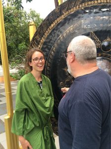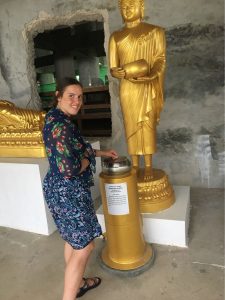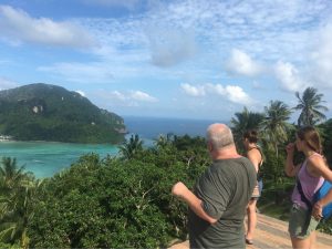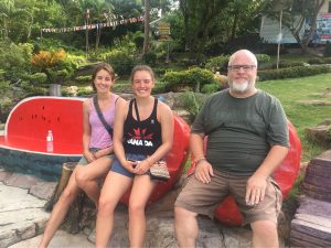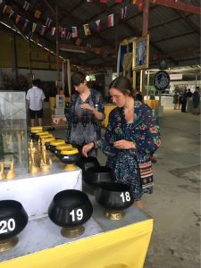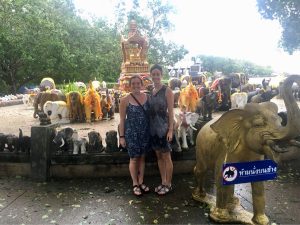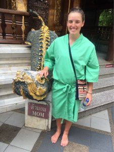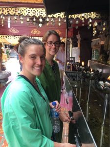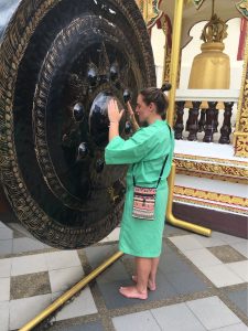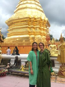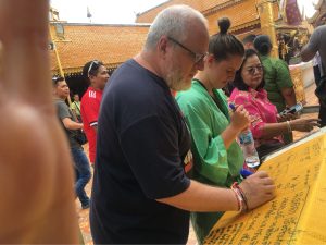 Since the weather was cooperating with only some very light cloud cover, we figured we would seize the moment and get a Songtao (covered red truck with two benches in back) to transport us up to DoiSuthep. A visit to this temple provides a spectacular view of the city as it is a 14km drive up a nearby mountain with a gorgeous albeit very busy and touristy temple at the top. We were able to be blessed again by a Buddhist monk, who did not tie the bracelets on us ladies, (he laid them across our wrists). Unlike the last monk who CAREFULLY tied them on without touching us. This monk was not taking any chances…..