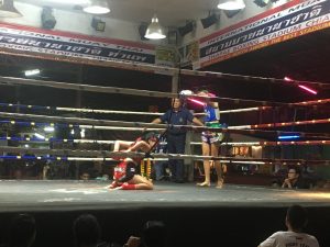 The first two fights were ‘lady fights’ and Ice’s fight was #2. It was very slow at first but you can tell as soon as they had sized each other up, it got a lot more intense. Ice was KO’d after a punch to the face in round two. So I could tell this was hard for Riam to watch. This was her 10th match and she had won 7 so far, but they knew this was a formidable opponent.