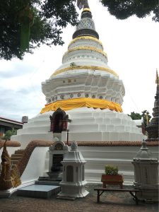Now, it was lovely. A Truly lovely little oasis right in the middle of the hustle and bustle of the city. Often I don’t know why or how this occurs, and maybe it’s just my imagination, or the POWER of the mind, but I find the second I step over the threshold onto temple grounds, the sounds and chaos of the city fall magically away and it becomes so quiet and serene. This time was no exception! I do need to note that this is my 11th visit to Thailand and I’m sure I’ve visited well over 100 temples and while there are a lot of restrictions/expectations around dress (for women especially), I’ve never EVER seen a sign expressly prohibiting women. So while I was allowed to go anywhere on the grounds, and in the temple once I’d completely covered myself (which is always pleasant in 100 degree heat😅) , I was NOT allowed up to the Chedi. At all. Hmmmm! Do they not know this is MY temple?????? You can see the sign on the steps and there was one on all four sides 🤔. No excuse for not knowing…..