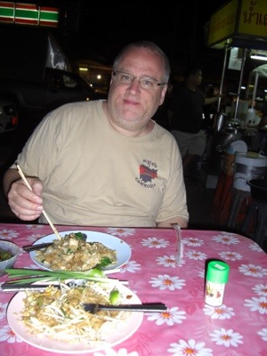 We had street food for supper tonight…there is a huge collection of mobile street carts that pop up right before supper all over the place….but we went over to Chiang Mai gate tonight. We had pomello, pad thai, pad see ewe, chinese donuts and a lemon shake for 120 baht….yes, that is just under $4 and we were stuffed.